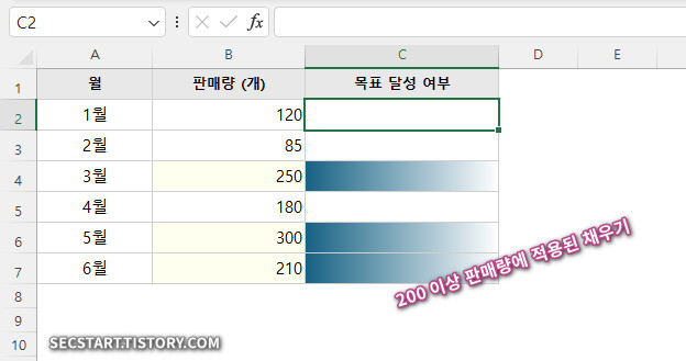 이렇게 적용하고 완료하면 데이터 막대는 아니지만 판매량의 수치를 체크하고 정해진 달성량(200) 이상의 값을 한눈에 띄게 할 수 있어요.
