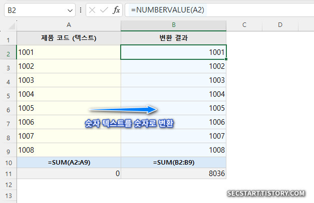 왼쪽에 있는 '제품 코드'는 사실 텍스트로 입력되어 있어서 SUM 함수로 합계를 구할 수 없어요.(A11 합계는 0) 이걸 NUMBERVALUE 함수로 숫자로 바꿔 합계를 구하면 정상 계산이 이뤄져요. (B11 합계는 8036)