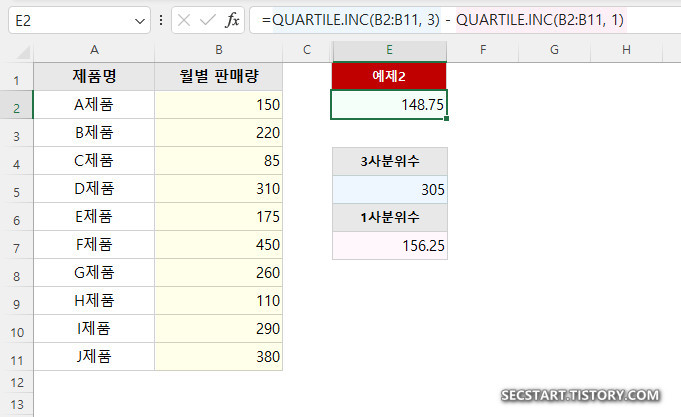 =QUARTILE.INC(B2:B11, 3) - QUARTILE.INC(B2:B11, 1) //결과: 148.75