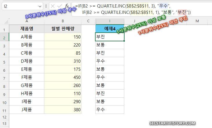 =IF(B2 >= QUARTILE.INC($B$2:$B$11, 3), "우수", IF(B2 >= QUARTILE.INC($B$2:$B$11, 1), "보통", "부진"))