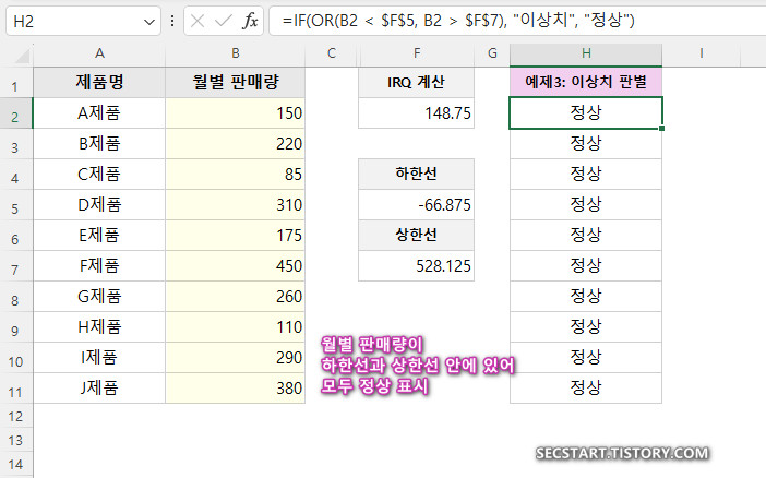 =IF(OR(B2 < $F$5, B2 > $F$7), "이상치", "정상")
