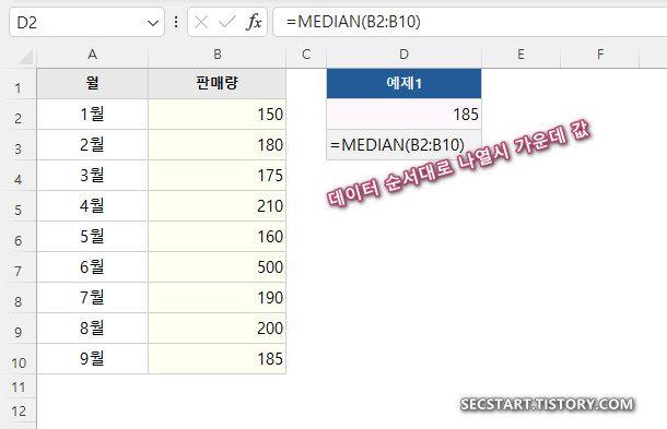 6월의 판매량(500)이 유독 높지만, MEDIAN 함수는 이에 영향을 받지 않고 데이터의 정확한 중앙값인 185를 찾아냈어요. 만약 AVERAGE 함수를 썼다면 결과는 약 217로, 중간값과 꽤 차이가 났을 거예요.