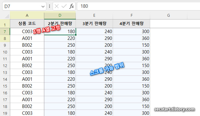 이제 마우스 스크롤을 아무리 내려도 '상품 코드', '상품명' 같은 제목 행은 화면 상단에 찰싹 붙어있을 거예요.