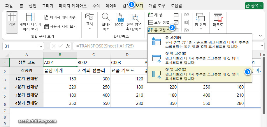 - [보기] > [틀 고정] > [첫 행 고정]