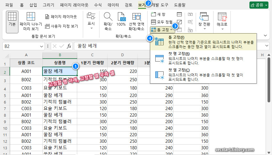 - [보기] 탭에서 [틀 고정]을 클릭합니다.