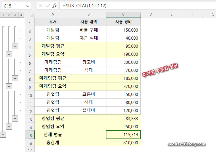 "합계 말고 평균도 같이 보고 싶은데, 방법이 없나요?" 왜 없겠어요! 부분합은 여러 함수를 중첩해서 사용할 수 있답니다. 이번에는 부서별로 경비의 합계와 평균을 동시에 구해볼게요.