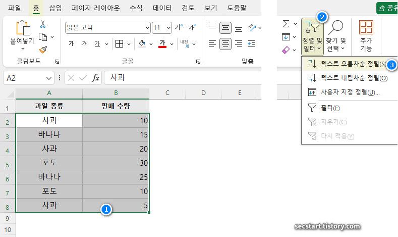 기준이 되는 필드를 반드시 먼저 정렬해야 한답니다. 여기서는 '과일 종류' 를 기준으로 오름차순 정렬해볼게요.