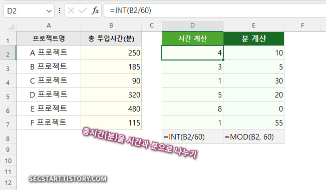 총 투입시간을 60 으로 나눈 '몫' 은 시간이 되고, '나머지' 는 분이 되겠죠? '몫' 을 구하는 INT 함수와 '나머지' 를 구하는 MOD 함수를 함께 사용하면 시간을 깔끔하게 분리해서 표시할 수 있습니다.