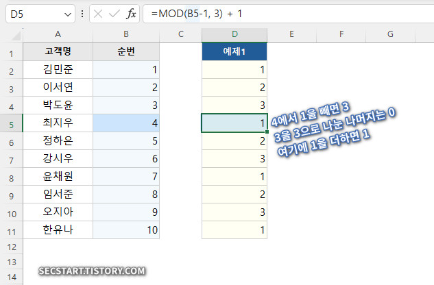📌 [핵심] MOD 함수는 나눗셈의 '나머지'를 구해주는 아주 유용한 함수예요.