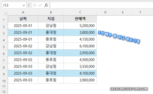 예제 3: 3번째 행마다 배경색 넣기 (고급: 조건부 서식 활용)