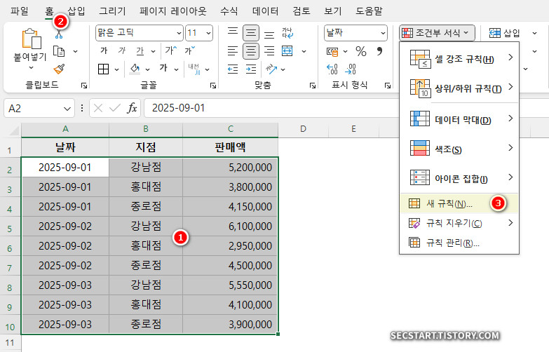 ㄴ. 홈 탭 → 스타일 그룹 → 조건부 서식 → 새 규칙 을 클릭하세요.