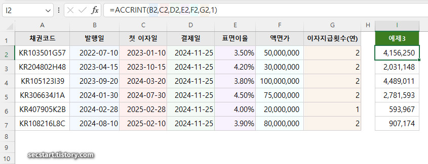백문이 불여일견! 직접 예제를 통해 ACCRINT 함수를 어떻게 활용하는지 알아볼게요.