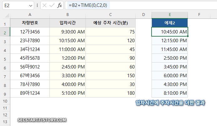 TIME 함수를 이용하면 특정 시간에 원하는 시간을 더하거나 빼는 것도 아주 쉬워요. 주차장 입차 시간에 예상 주차 시간을 더해 출차 예정 시간을 계산해볼까요?