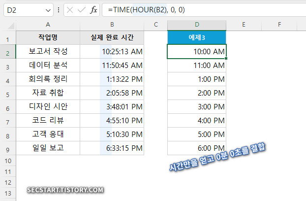 C2 셀에 아래 수식을 입력합니다. HOUR 함수로 '시' 만 추출하고, 분과 초는 0 으로 고정하여 새로운 시간을 만드는 원리입니다.