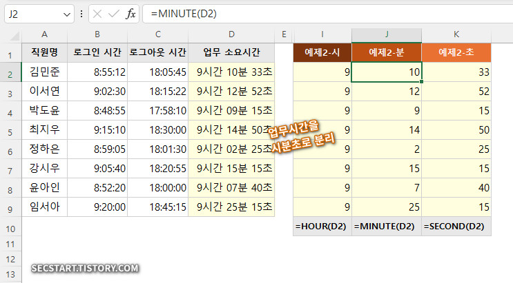 D열의 '업무 소요시간' 은 로그아웃 시간 - 로그인 시간 으로 계산된 값입니다. 이 시간 값에서 총 근무가 '몇 시간, 몇 분, 몇 초'인지를 각각 분리해볼까요?