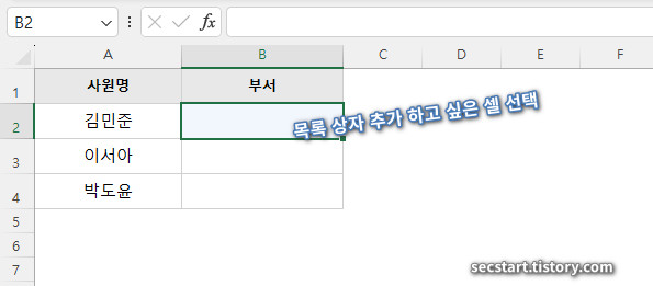 먼저, 목록 상자를 만들고 싶은 셀(예: B2 셀)을 마우스로 콕! 클릭해 주세요.