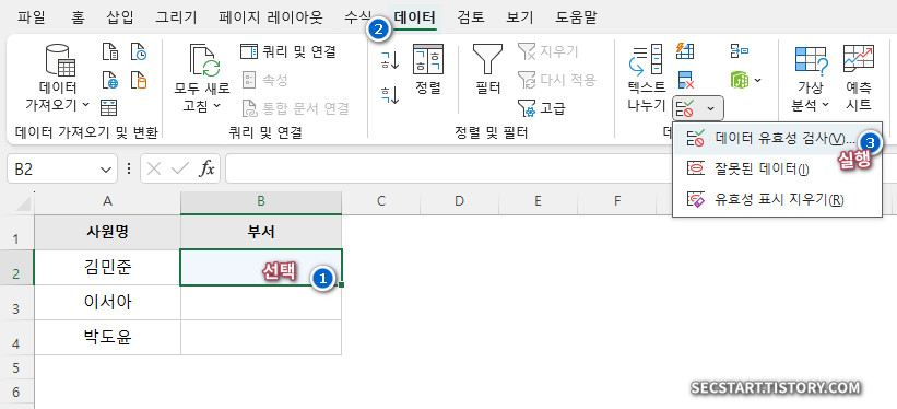 2. 데이터 유효성 검사 메뉴 찾아가기