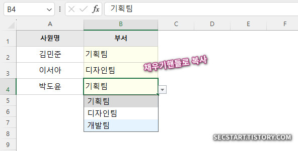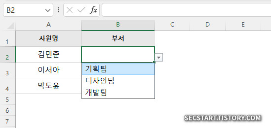 가장 기본적인 방법부터 차근차근 시작해 볼까요? 목록에 들어갈 항목이 몇 개 안 될 때 아주 유용한 방법이에요. 예를 들어 '부서' 를 입력하는 셀에 '기획팀', '디자인팀', '개발팀' 만 선택할 수 있도록 만들어 볼게요.