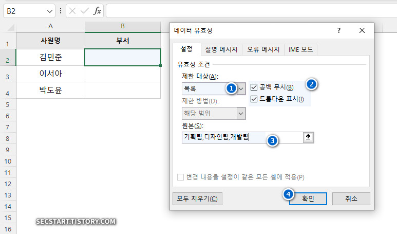 - 빈 셀 무시 옵션: [설정] 탭에 있는 '빈 셀 무시'에 체크되어 있으면 값을 입력하지 않고 그냥 넘어가도 오류가 나지 않아요. 필수 입력 항목이 아니라면 체크된 상태로 두는 것이 좋아요.
