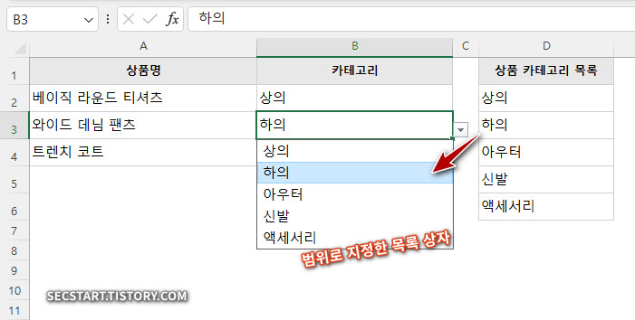 이번에는 '상품 카테고리' 를 목록 상자로 만들어 볼게요.