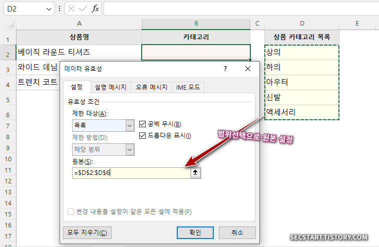 - 원본(S): 이제 직접 입력하는 대신, 아까 만들어 둔 '상품 카테고리 목록' 데이터가 있는 셀 범위를 마우스로 쭉 드래그해서 지정해 주세요. 또는 '=' 기호를 입력한 뒤 범위를 지정해도 돼요!