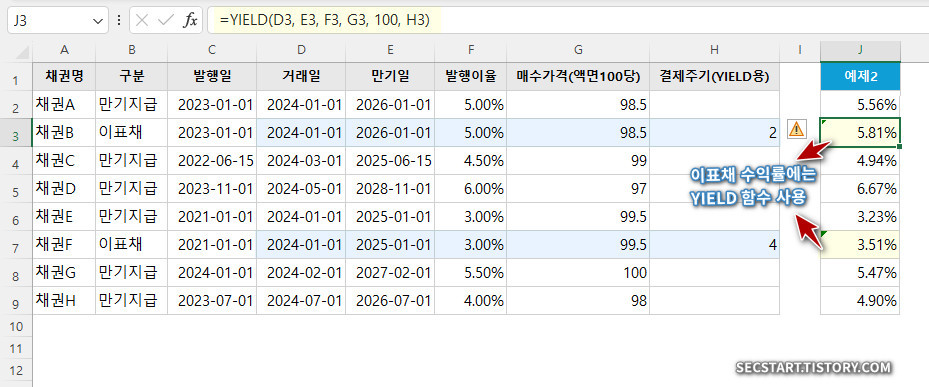 '이표채' 는 YIELD 함수를 써야 해요! (YIELD 함수는 인수가 조금 달라요)