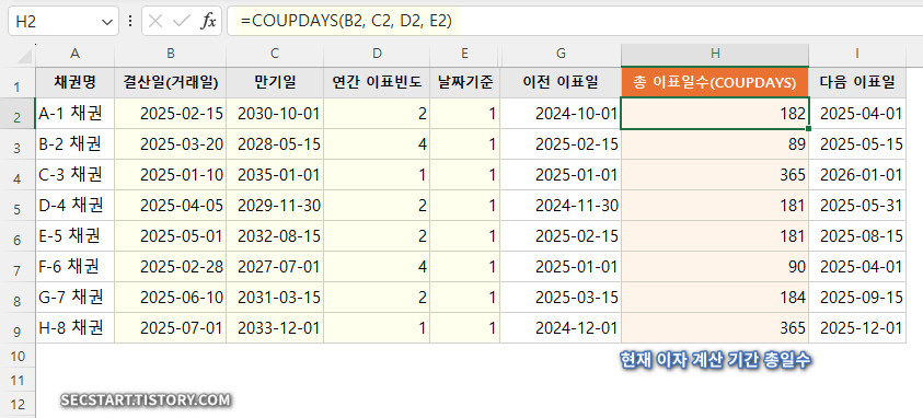 위에서 사용한 동일한 예제 데이터에, H열에 '총 이표 기간 일수'를 계산해 볼게요.