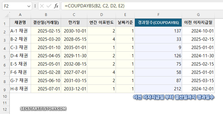 🗓️ 1. COUPDAYBS 함수: 이표 시작일부터 결산일까지 (경과일수)