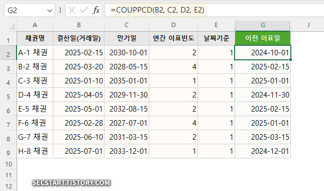 ⏪ 3. COUPPCD 함수: 직전 이표 지급일