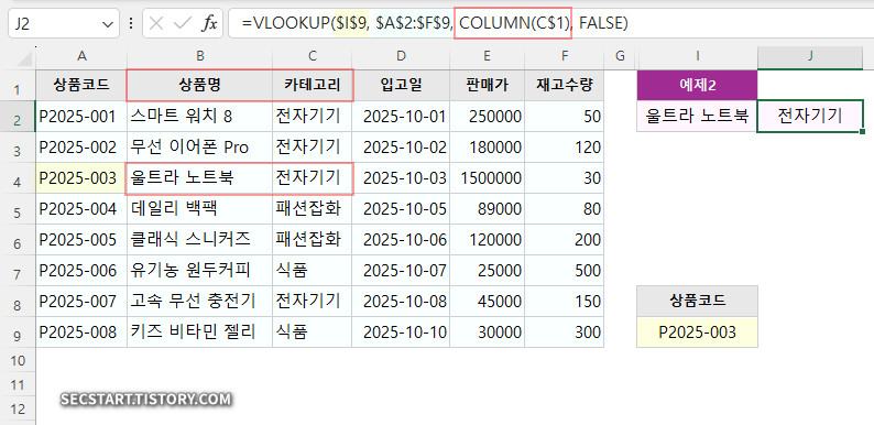 예제 2: [중급] VLOOKUP과 COLUMN 함수 조합 (수식 복사 끝판왕)