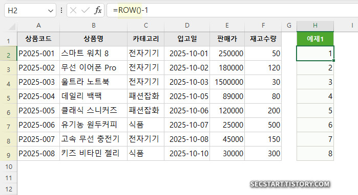 만약 제목 행이 2줄이라 데이터가 3행부터 시작하면? =ROW()-2를 쓰면 되겠죠?