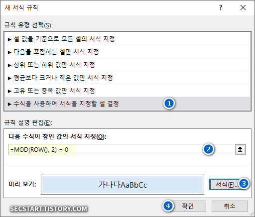 - 즉, 이 나머지가 0 (짝수)인 행에만 지정한 서식을 적용하라는 뜻이에요!