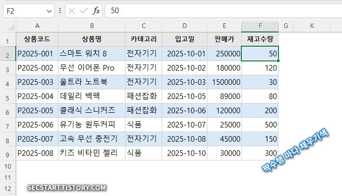 데이터가 길어지면 줄을 잘못 읽기 쉬워요. 이럴 때 짝수/홀수 행마다 색을 다르게 칠하면 가독성이 확 올라갑니다.