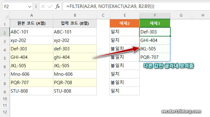 (FILTER 함수 활용) 불일치하는 '원본 코드'만 찾아오기
