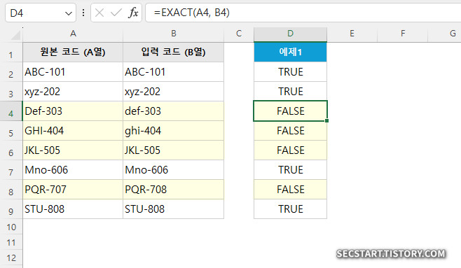 가장 기본적인 사용법입니다. D열에 원본 코드(A열)와 입력 코드(B열)가 정확히 일치하는지 확인해 보겠습니다.