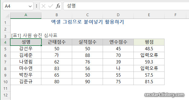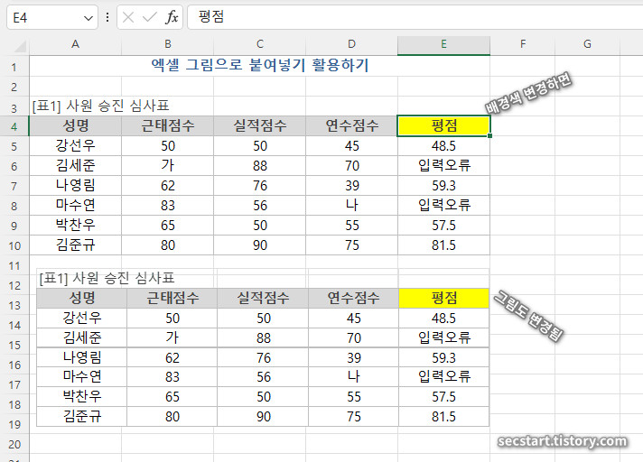 - 이제 그림의 원본 영역 데이터를 변경하면, 붙여넣기 된 그림의 내용도 자동으로 함께 변경됩니다. 예를 들어, 원본 영역 E4 셀의 배경색을 바꾸면 , 붙여넣기 된 그림의 '평점' 배경색도 함께 변경되는 것을 확인할 수 있습니다. 원본의 수식이나 다른 데이터를 변경해도 마찬가지입니다 .