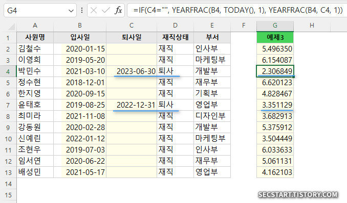 =IF(퇴사일="", YEARFRAC(입사일, TODAY(), 1), YEARFRAC(입사일, 퇴사일, 1))