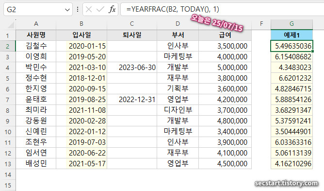 =YEARFRAC(입사일, TODAY(), 1) - 프로젝트 기간: