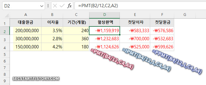 엑셀 PMT IPMT PPMT 함수 완벽 가이드 - 대출 상환 계산 쉽게 마스터하기