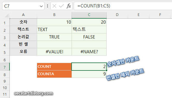 | 카운트 대상 | 숫자만 | 빈 셀을 제외한 모든 값 |