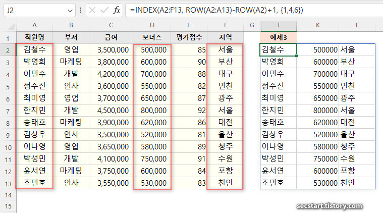 직원명, 보너스, 지역처럼 비연속적인 열들을 선택하는 방법이에요. 1열, 4열, 6열만 골라서 추출하여 필요한 정보만 간추려 볼 수 있죠.
