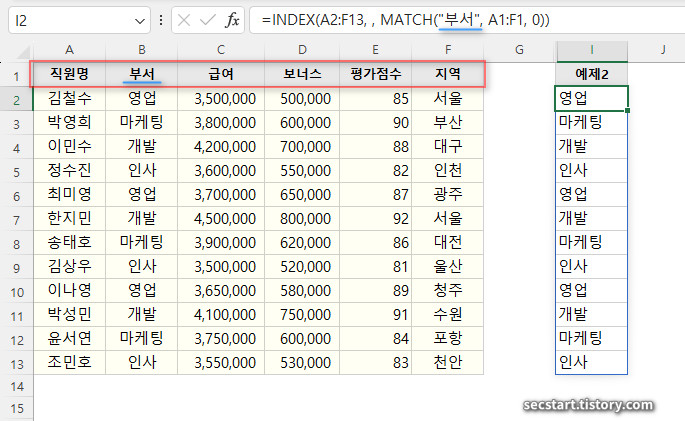 MATCH 로 "부서"의 위치(2번 칼럼)를 찾은 뒤 INDEX 로 해당 칼럼을 추출해요.