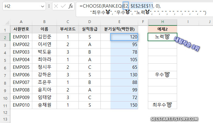 =CHOOSE(RANK.EQ(E2, $E$2:$E$11, 0), "최우수🥇", "우수🥈", "노력🥉", " ", " ", " ", " ", " ", " ", " ")