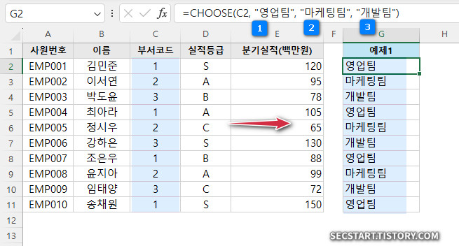 1️⃣ 부서명 넣기: =CHOOSE(부서코드, "영업", "마케팅", "개발")