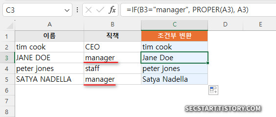 이번엔 조금 더 머리를 써볼까요? 특정 조건에 해당할 때만 PROPER 함수를 적용하는 방법입니다. 예를 들어, '직책' 이 'Manager' 인 경우에만 이름을 변환하고, 나머지는 그대로 두는 거죠.