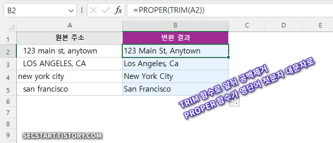 TRIM 함수로 셀 텍스트 전후 공백을 먼저 제거하고, 그 결과를 PROPER 함수로 변환하니 훨씬 깔끔해졌죠? 이렇게 함수 중첩해 여러 기능을 한번에 처리하면 실무 활용도를 확 높여준답니다!
