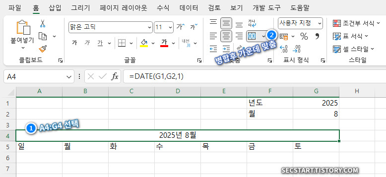 이 함수는 G1년 G2월의 첫째 날을 자동으로 계산해줘요. 예를 들어 G1이 2025, G2가 8이면 2025년 8월 1일이 결과로 나오죠.