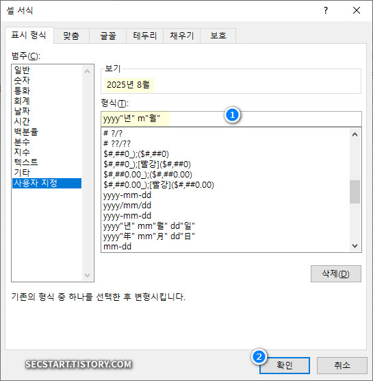 - 서식 코드(표시 형식>사용자 지정): yyyy"년" m"월"