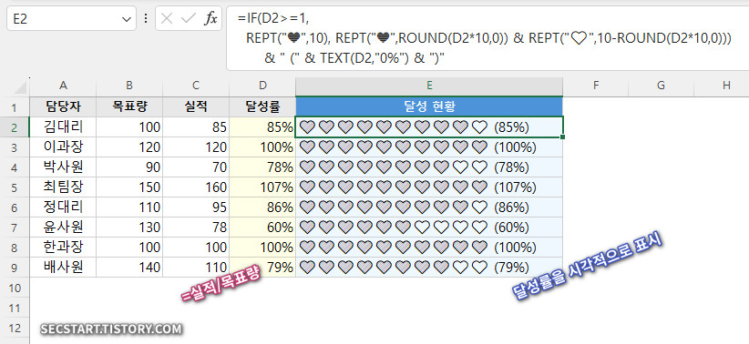 ㄱ. 달성률이 100%(1) 이상이면 파란 하트 10개 표시 : REPT("💙",10)