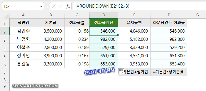 성과급 계산 시 천 단위 아래는 절사하여 정확한 지급액을 계산하는 예제예요!